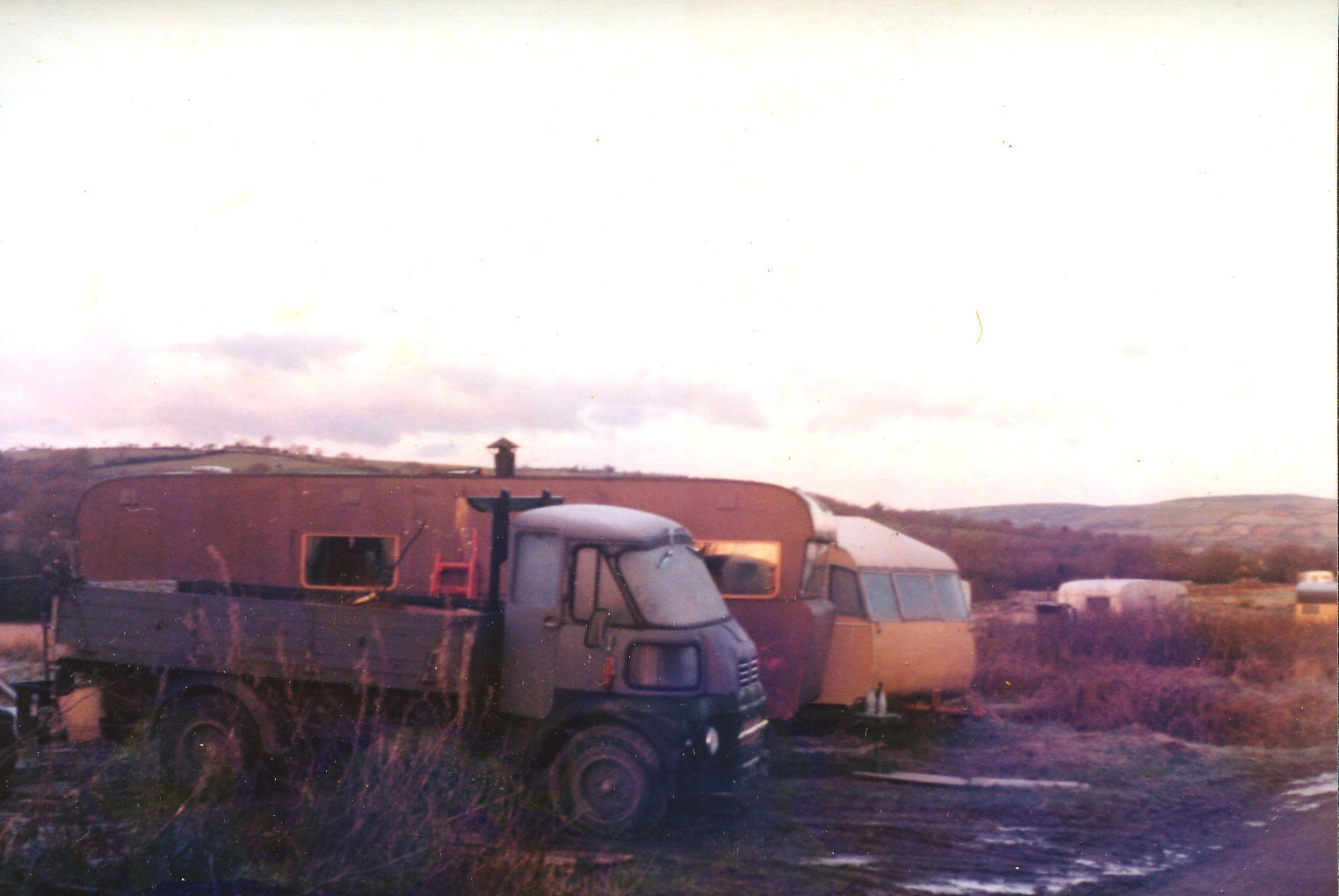 Having said that I still had a lot of respect for people who were doing it in other ways. I was an occasional visitor to Tally Valley (tipi valley)(about 18 miles from the common but that was considered to be neighbours out there then). - I loved what was going on there. There was a natural barrier to motor vehicles there as I remember. That double-decker bus was the only one there, and that was high up on the edge of the moor. I've forgotten his name for now, but I believe he was the first to buy land from Nab (the man who initially owned the valley). He had to make a track to get the bus there. He was already set up with his bus blocked up and firmly rooted and his patch like a mini-farm, before the tipi crowd started buying land, lower down the valley, from Nab, It wasn't long before the whole valley was owned by various hippy types, mostly tipi dwellers but some benders too. The only other wheeled home low down in the valley was an old style showmans wagon. I think it was Cherry who lived there.